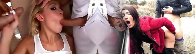 A chubby German nymph gets her throat fucked by four hard peckers